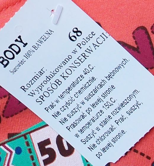 Wszystkie ubranka powinny mieć dwa rodzaje metek. Jedną dużą papierową ze wszystkimi informacjami o składzie surowcowym ciuszka, przepisem prania, rozmiarem i nazwą, oraz informacjami o producencie. Jest też druga metka materiałowa wszywana między szwy ubranka. Metka ta zawiera skrócony przepis prania pokazany na znanych powszechnie symbolach oraz rozmiar ubranka. Metkę papierową odcinamy i wyrzucamy. Drugą metkę możemy zostawić bo podaje ona cenne informacje o sposobie prania: dopuszczalnej temperaturze i sposobie prania.